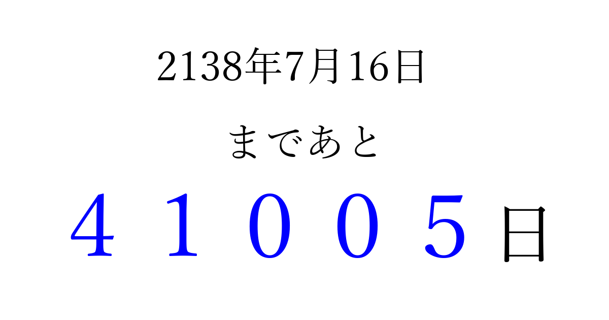 2138年7月16日(水)まで あと 99999 日です 追加すると、トップページからすぐ選べるようになります ※2026/04/09現在の結果です。 最新の状態に更新する ↓シェアして、タイムライン上にカウントダウンを表示しよう!↓ 📤 この結果を共有する Tweet シェア Threads Bluesky 別の日付でカウントダウン 2138年7月のカレンダー このページをブックマークに追加すると、いつでもカウントダウンを確認できます。 (PC: Ctrl+D / Mac: ⌘+D) hitome-notes.comでは以下のページも運営しています。 指定日と期間から日付を計算 | ガチャ確率計算・シミュレーション | プライバシー・ポリシー 運営者:Avocado