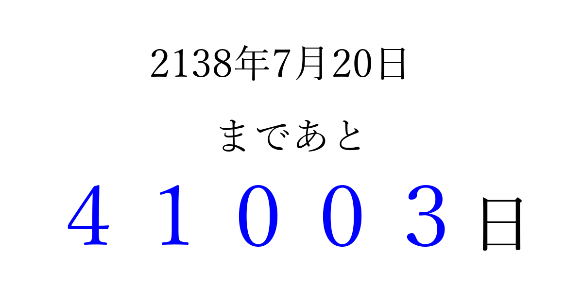 2138年7月20日(日)まで あと 99999 日です 追加すると、トップページからすぐ選べるようになります ※2026/04/15現在の結果です。 最新の状態に更新する ↓シェアして、タイムライン上にカウントダウンを表示しよう!↓ 📤 この結果を共有する Tweet シェア Threads Bluesky 別の日付でカウントダウン 2138年7月のカレンダー このページをブックマークに追加すると、いつでもカウントダウンを確認できます。 (PC: Ctrl+D / Mac: ⌘+D) hitome-notes.comでは以下のページも運営しています。 指定日と期間から日付を計算 | ガチャ確率計算・シミュレーション | プライバシー・ポリシー 運営者:Avocado