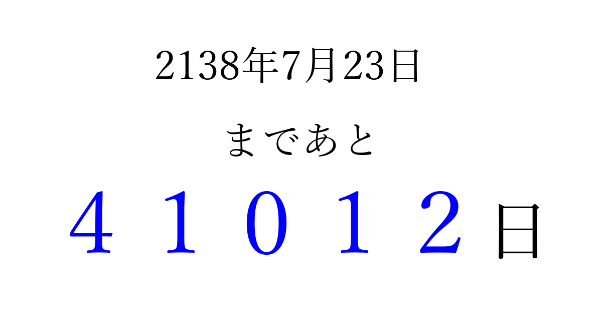 2138年7月23日(水)まで あと 99999 日です 追加すると、トップページからすぐ選べるようになります ※2026/04/09現在の結果です。 最新の状態に更新する ↓シェアして、タイムライン上にカウントダウンを表示しよう!↓ 📤 この結果を共有する Tweet シェア Threads Bluesky 別の日付でカウントダウン 2138年7月のカレンダー このページをブックマークに追加すると、いつでもカウントダウンを確認できます。 (PC: Ctrl+D / Mac: ⌘+D) hitome-notes.comでは以下のページも運営しています。 指定日と期間から日付を計算 | ガチャ確率計算・シミュレーション | プライバシー・ポリシー 運営者:Avocado