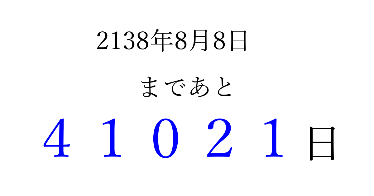 2138年8月8日(金)まで あと 99999 日です 追加すると、トップページからすぐ選べるようになります ※2026/04/16現在の結果です。 最新の状態に更新する ↓シェアして、タイムライン上にカウントダウンを表示しよう!↓ 📤 この結果を共有する Tweet シェア Threads Bluesky 別の日付でカウントダウン 2138年8月のカレンダー このページをブックマークに追加すると、いつでもカウントダウンを確認できます。 (PC: Ctrl+D / Mac: ⌘+D) hitome-notes.comでは以下のページも運営しています。 指定日と期間から日付を計算 | ガチャ確率計算・シミュレーション | プライバシー・ポリシー 運営者:Avocado