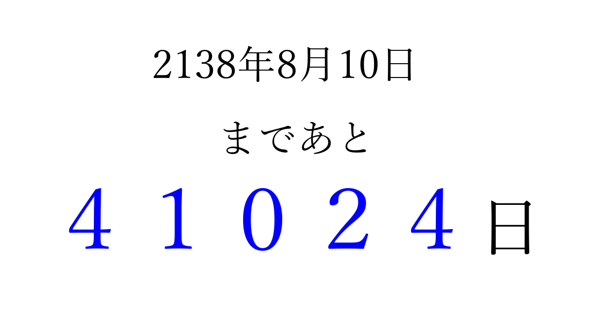 2138年8月10日(日)まで あと 99999 日です 追加すると、トップページからすぐ選べるようになります ※2026/04/16現在の結果です。 最新の状態に更新する ↓シェアして、タイムライン上にカウントダウンを表示しよう!↓ 📤 この結果を共有する Tweet シェア Threads Bluesky 別の日付でカウントダウン 2138年8月のカレンダー このページをブックマークに追加すると、いつでもカウントダウンを確認できます。 (PC: Ctrl+D / Mac: ⌘+D) hitome-notes.comでは以下のページも運営しています。 指定日と期間から日付を計算 | ガチャ確率計算・シミュレーション | プライバシー・ポリシー 運営者:Avocado