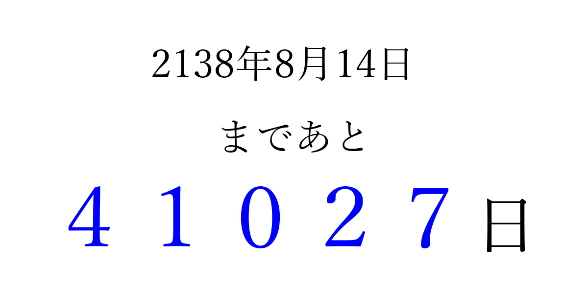 2138年8月14日(木)まで あと 99999 日です 追加すると、トップページからすぐ選べるようになります ※2026/04/16現在の結果です。 最新の状態に更新する ↓シェアして、タイムライン上にカウントダウンを表示しよう!↓ 📤 この結果を共有する Tweet シェア Threads Bluesky 別の日付でカウントダウン 2138年8月のカレンダー このページをブックマークに追加すると、いつでもカウントダウンを確認できます。 (PC: Ctrl+D / Mac: ⌘+D) hitome-notes.comでは以下のページも運営しています。 指定日と期間から日付を計算 | ガチャ確率計算・シミュレーション | プライバシー・ポリシー 運営者:Avocado