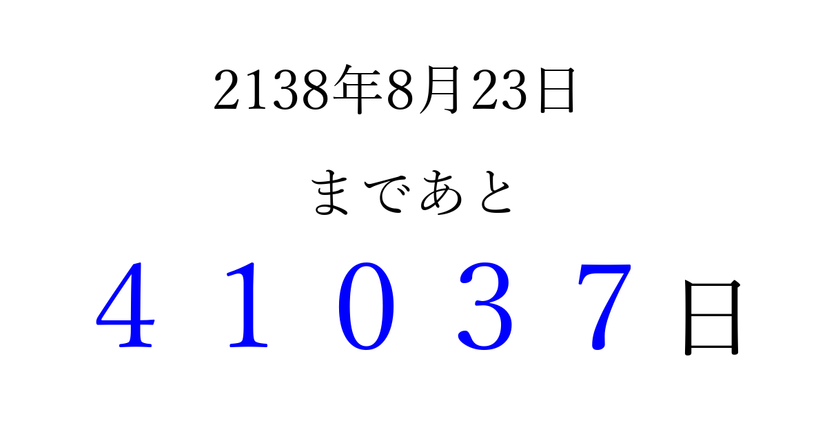 2138年8月23日(土)まで あと 99999 日です 追加すると、トップページからすぐ選べるようになります ※2026/04/16現在の結果です。 最新の状態に更新する ↓シェアして、タイムライン上にカウントダウンを表示しよう!↓ 📤 この結果を共有する Tweet シェア Threads Bluesky 別の日付でカウントダウン 2138年8月のカレンダー このページをブックマークに追加すると、いつでもカウントダウンを確認できます。 (PC: Ctrl+D / Mac: ⌘+D) hitome-notes.comでは以下のページも運営しています。 指定日と期間から日付を計算 | ガチャ確率計算・シミュレーション | プライバシー・ポリシー 運営者:Avocado