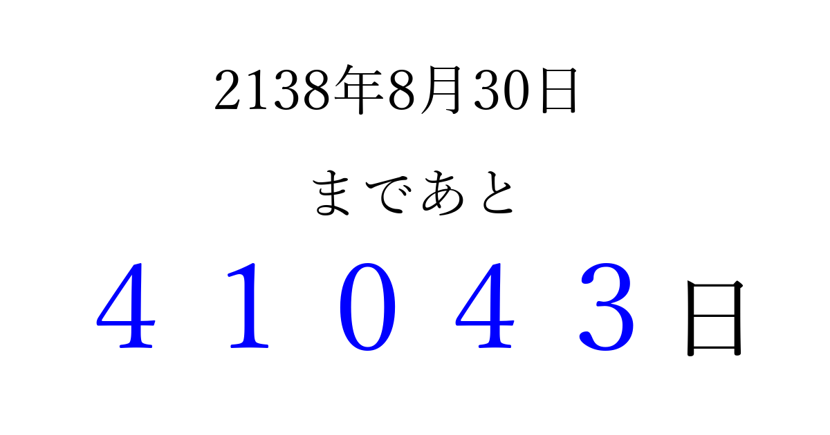 2138年8月30日(土)まで あと 99999 日です 追加すると、トップページからすぐ選べるようになります ※2026/04/16現在の結果です。 最新の状態に更新する ↓シェアして、タイムライン上にカウントダウンを表示しよう!↓ 📤 この結果を共有する Tweet シェア Threads Bluesky 別の日付でカウントダウン 2138年8月のカレンダー このページをブックマークに追加すると、いつでもカウントダウンを確認できます。 (PC: Ctrl+D / Mac: ⌘+D) hitome-notes.comでは以下のページも運営しています。 指定日と期間から日付を計算 | ガチャ確率計算・シミュレーション | プライバシー・ポリシー 運営者:Avocado