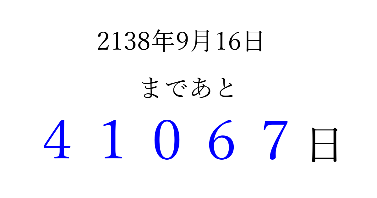 2138年9月16日(火)まで あと 99999 日です 追加すると、トップページからすぐ選べるようになります ※2026/04/09現在の結果です。 最新の状態に更新する ↓シェアして、タイムライン上にカウントダウンを表示しよう!↓ 📤 この結果を共有する Tweet シェア Threads Bluesky 別の日付でカウントダウン 2138年9月のカレンダー このページをブックマークに追加すると、いつでもカウントダウンを確認できます。 (PC: Ctrl+D / Mac: ⌘+D) hitome-notes.comでは以下のページも運営しています。 指定日と期間から日付を計算 | ガチャ確率計算・シミュレーション | プライバシー・ポリシー 運営者:Avocado