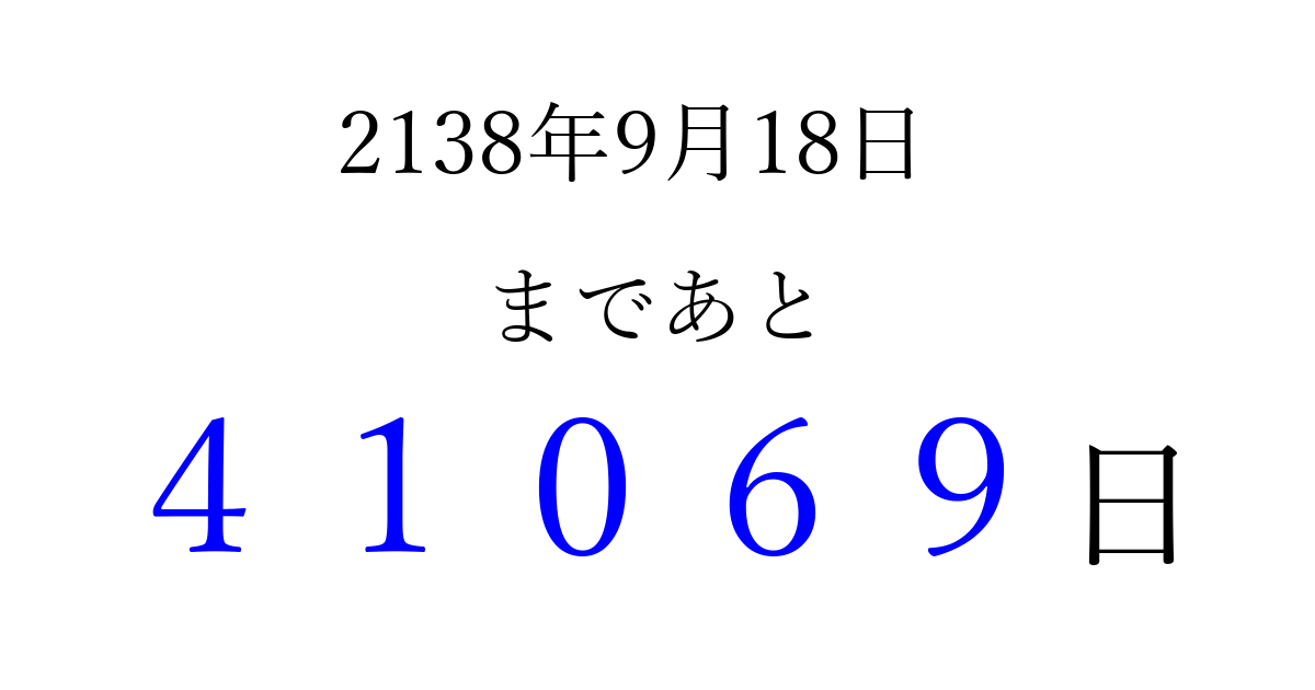 2138年9月18日(木)まで あと 99999 日です 追加すると、トップページからすぐ選べるようになります ※2026/04/09現在の結果です。 最新の状態に更新する ↓シェアして、タイムライン上にカウントダウンを表示しよう!↓ 📤 この結果を共有する Tweet シェア Threads Bluesky 別の日付でカウントダウン 2138年9月のカレンダー このページをブックマークに追加すると、いつでもカウントダウンを確認できます。 (PC: Ctrl+D / Mac: ⌘+D) hitome-notes.comでは以下のページも運営しています。 指定日と期間から日付を計算 | ガチャ確率計算・シミュレーション | プライバシー・ポリシー 運営者:Avocado