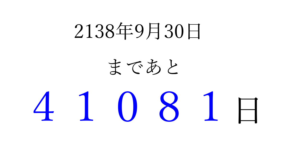 2138年9月30日(火)まで あと 99999 日です 追加すると、トップページからすぐ選べるようになります ※2026/04/09現在の結果です。 最新の状態に更新する ↓シェアして、タイムライン上にカウントダウンを表示しよう!↓ 📤 この結果を共有する Tweet シェア Threads Bluesky 別の日付でカウントダウン 2138年9月のカレンダー このページをブックマークに追加すると、いつでもカウントダウンを確認できます。 (PC: Ctrl+D / Mac: ⌘+D) hitome-notes.comでは以下のページも運営しています。 指定日と期間から日付を計算 | ガチャ確率計算・シミュレーション | プライバシー・ポリシー 運営者:Avocado