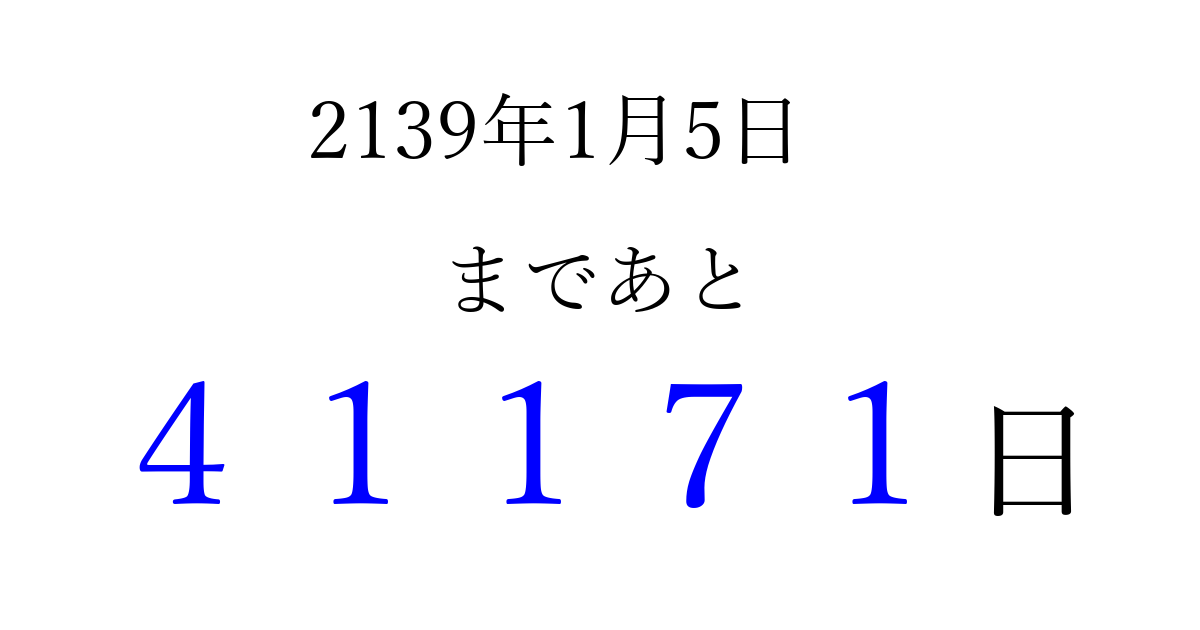 2139年1月5日(月)まで あと 99999 日です 追加すると、トップページからすぐ選べるようになります ※2026/04/16現在の結果です。 最新の状態に更新する ↓シェアして、タイムライン上にカウントダウンを表示しよう!↓ 📤 この結果を共有する Tweet シェア Threads Bluesky 別の日付でカウントダウン 2139年1月のカレンダー このページをブックマークに追加すると、いつでもカウントダウンを確認できます。 (PC: Ctrl+D / Mac: ⌘+D) hitome-notes.comでは以下のページも運営しています。 指定日と期間から日付を計算 | ガチャ確率計算・シミュレーション | プライバシー・ポリシー 運営者:Avocado