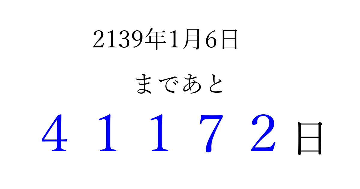 2139年1月6日(火)まで あと 99999 日です 追加すると、トップページからすぐ選べるようになります ※2026/04/16現在の結果です。 最新の状態に更新する ↓シェアして、タイムライン上にカウントダウンを表示しよう!↓ 📤 この結果を共有する Tweet シェア Threads Bluesky 別の日付でカウントダウン 2139年1月のカレンダー このページをブックマークに追加すると、いつでもカウントダウンを確認できます。 (PC: Ctrl+D / Mac: ⌘+D) hitome-notes.comでは以下のページも運営しています。 指定日と期間から日付を計算 | ガチャ確率計算・シミュレーション | プライバシー・ポリシー 運営者:Avocado