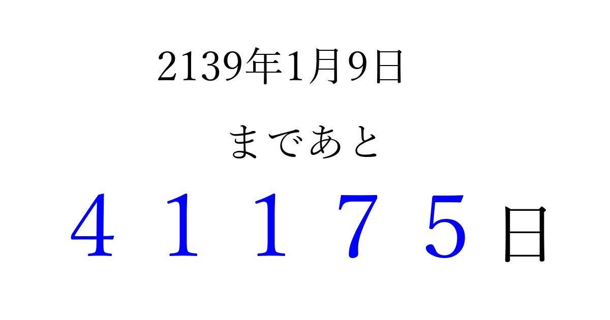 2139年1月9日(金)まで あと 99999 日です 追加すると、トップページからすぐ選べるようになります ※2026/04/16現在の結果です。 最新の状態に更新する ↓シェアして、タイムライン上にカウントダウンを表示しよう!↓ 📤 この結果を共有する Tweet シェア Threads Bluesky 別の日付でカウントダウン 2139年1月のカレンダー このページをブックマークに追加すると、いつでもカウントダウンを確認できます。 (PC: Ctrl+D / Mac: ⌘+D) hitome-notes.comでは以下のページも運営しています。 指定日と期間から日付を計算 | ガチャ確率計算・シミュレーション | プライバシー・ポリシー 運営者:Avocado