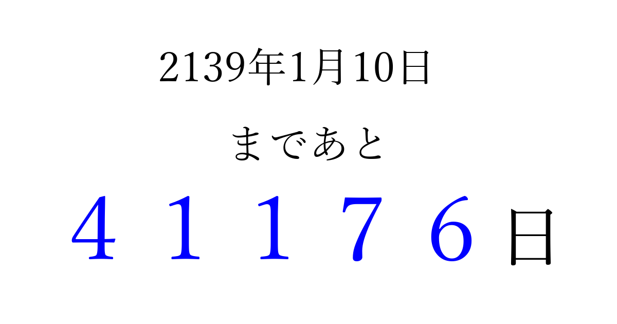 2139年1月10日(土)まで あと 99999 日です 追加すると、トップページからすぐ選べるようになります ※2026/04/16現在の結果です。 最新の状態に更新する ↓シェアして、タイムライン上にカウントダウンを表示しよう!↓ 📤 この結果を共有する Tweet シェア Threads Bluesky 別の日付でカウントダウン 2139年1月のカレンダー このページをブックマークに追加すると、いつでもカウントダウンを確認できます。 (PC: Ctrl+D / Mac: ⌘+D) hitome-notes.comでは以下のページも運営しています。 指定日と期間から日付を計算 | ガチャ確率計算・シミュレーション | プライバシー・ポリシー 運営者:Avocado