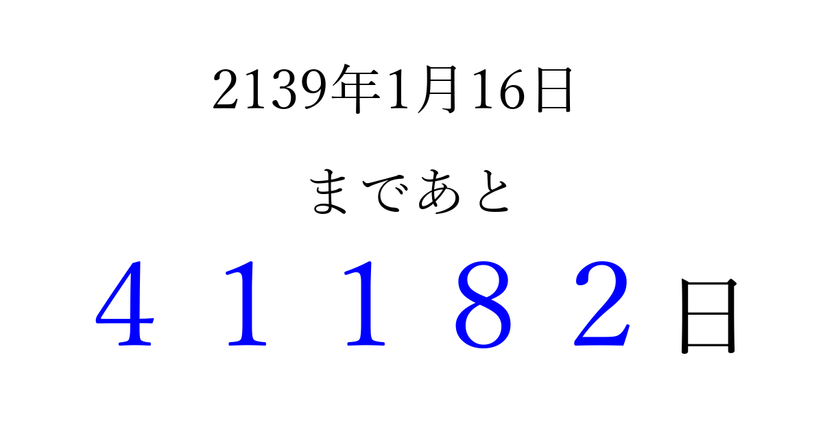 2139年1月16日(金)まで あと 99999 日です 追加すると、トップページからすぐ選べるようになります ※2026/04/16現在の結果です。 最新の状態に更新する ↓シェアして、タイムライン上にカウントダウンを表示しよう!↓ 📤 この結果を共有する Tweet シェア Threads Bluesky 別の日付でカウントダウン 2139年1月のカレンダー このページをブックマークに追加すると、いつでもカウントダウンを確認できます。 (PC: Ctrl+D / Mac: ⌘+D) hitome-notes.comでは以下のページも運営しています。 指定日と期間から日付を計算 | ガチャ確率計算・シミュレーション | プライバシー・ポリシー 運営者:Avocado