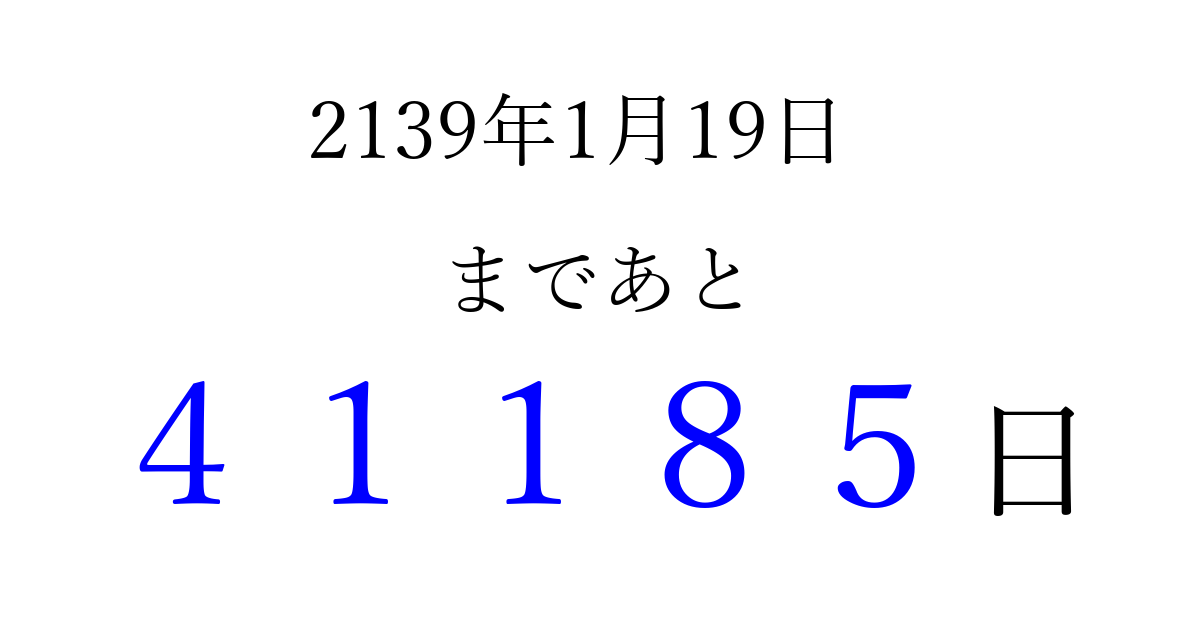 2139年1月19日(月)まで あと 99999 日です 追加すると、トップページからすぐ選べるようになります ※2026/04/16現在の結果です。 最新の状態に更新する ↓シェアして、タイムライン上にカウントダウンを表示しよう!↓ 📤 この結果を共有する Tweet シェア Threads Bluesky 別の日付でカウントダウン 2139年1月のカレンダー このページをブックマークに追加すると、いつでもカウントダウンを確認できます。 (PC: Ctrl+D / Mac: ⌘+D) hitome-notes.comでは以下のページも運営しています。 指定日と期間から日付を計算 | ガチャ確率計算・シミュレーション | プライバシー・ポリシー 運営者:Avocado