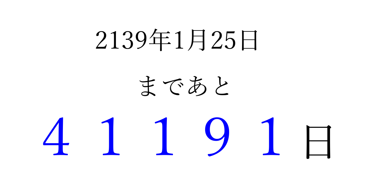 2139年1月25日(日)まで あと 99999 日です 追加すると、トップページからすぐ選べるようになります ※2026/04/16現在の結果です。 最新の状態に更新する ↓シェアして、タイムライン上にカウントダウンを表示しよう!↓ 📤 この結果を共有する Tweet シェア Threads Bluesky 別の日付でカウントダウン 2139年1月のカレンダー このページをブックマークに追加すると、いつでもカウントダウンを確認できます。 (PC: Ctrl+D / Mac: ⌘+D) hitome-notes.comでは以下のページも運営しています。 指定日と期間から日付を計算 | ガチャ確率計算・シミュレーション | プライバシー・ポリシー 運営者:Avocado