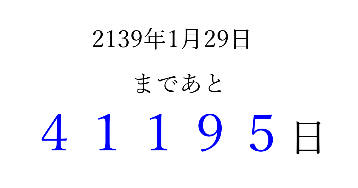 2139年1月29日(木)まで あと 99999 日です 追加すると、トップページからすぐ選べるようになります ※2026/04/16現在の結果です。 最新の状態に更新する ↓シェアして、タイムライン上にカウントダウンを表示しよう!↓ 📤 この結果を共有する Tweet シェア Threads Bluesky 別の日付でカウントダウン 2139年1月のカレンダー このページをブックマークに追加すると、いつでもカウントダウンを確認できます。 (PC: Ctrl+D / Mac: ⌘+D) hitome-notes.comでは以下のページも運営しています。 指定日と期間から日付を計算 | ガチャ確率計算・シミュレーション | プライバシー・ポリシー 運営者:Avocado