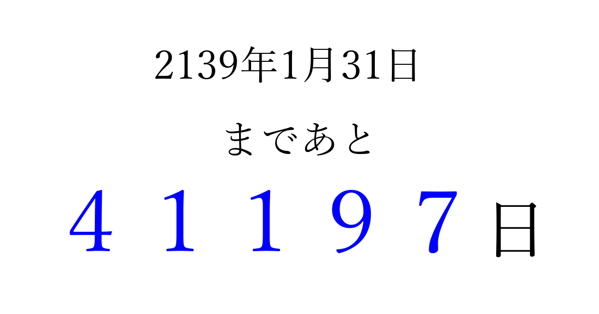 2139年1月31日(土)まで あと 99999 日です 追加すると、トップページからすぐ選べるようになります ※2026/04/16現在の結果です。 最新の状態に更新する ↓シェアして、タイムライン上にカウントダウンを表示しよう!↓ 📤 この結果を共有する Tweet シェア Threads Bluesky 別の日付でカウントダウン 2139年1月のカレンダー このページをブックマークに追加すると、いつでもカウントダウンを確認できます。 (PC: Ctrl+D / Mac: ⌘+D) hitome-notes.comでは以下のページも運営しています。 指定日と期間から日付を計算 | ガチャ確率計算・シミュレーション | プライバシー・ポリシー 運営者:Avocado