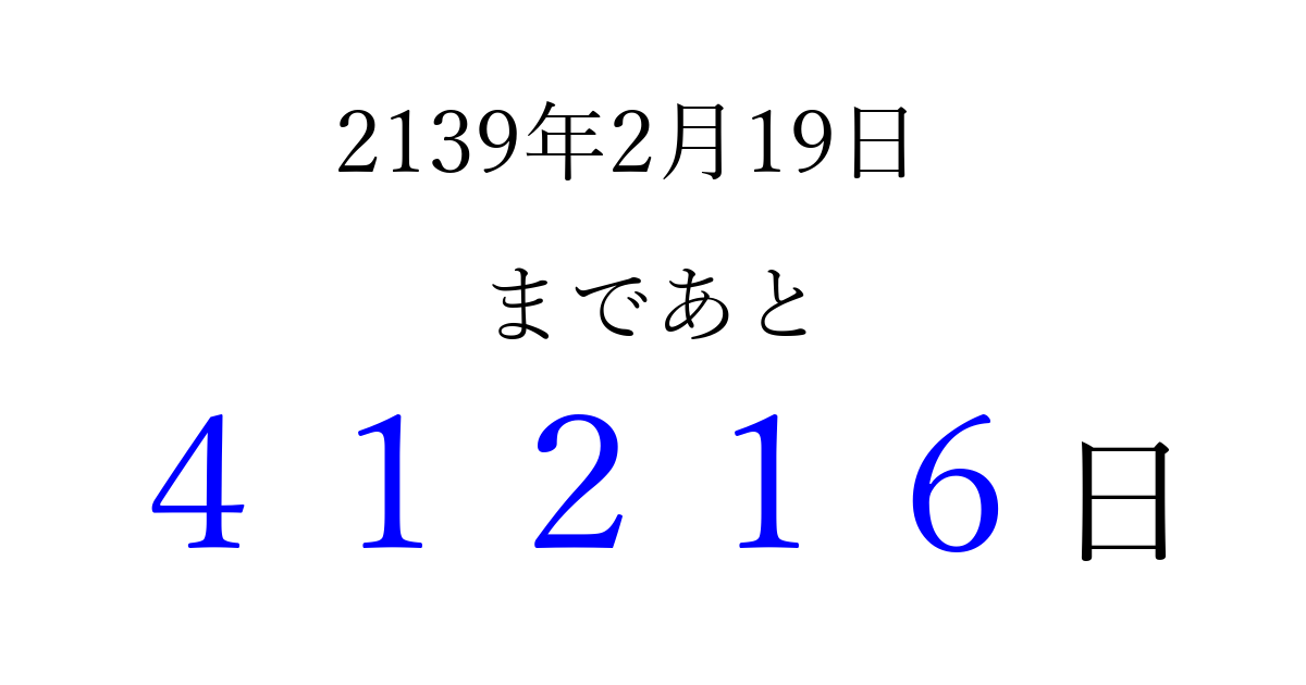 2139年2月19日(木)まで あと 99999 日です 追加すると、トップページからすぐ選べるようになります ※2026/04/16現在の結果です。 最新の状態に更新する ↓シェアして、タイムライン上にカウントダウンを表示しよう!↓ 📤 この結果を共有する Tweet シェア Threads Bluesky 別の日付でカウントダウン 2139年2月のカレンダー このページをブックマークに追加すると、いつでもカウントダウンを確認できます。 (PC: Ctrl+D / Mac: ⌘+D) hitome-notes.comでは以下のページも運営しています。 指定日と期間から日付を計算 | ガチャ確率計算・シミュレーション | プライバシー・ポリシー 運営者:Avocado