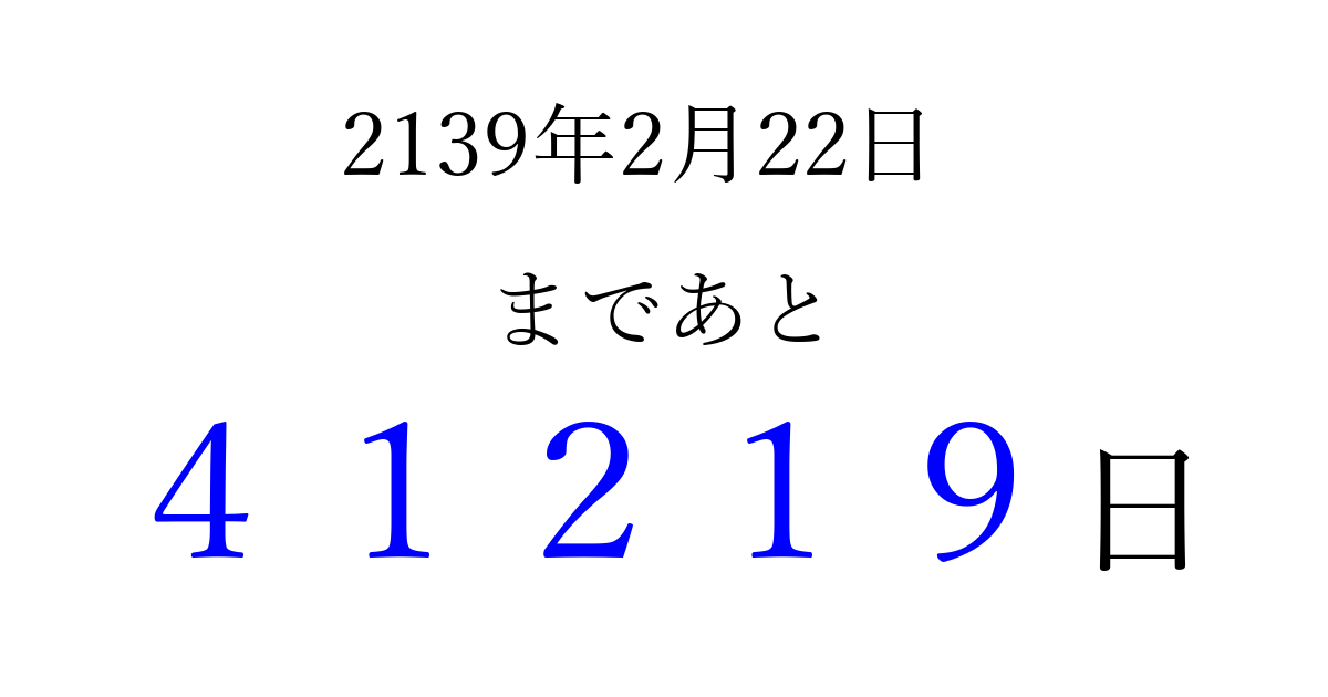 2139年2月22日(日)まで あと 99999 日です 追加すると、トップページからすぐ選べるようになります ※2026/04/16現在の結果です。 最新の状態に更新する ↓シェアして、タイムライン上にカウントダウンを表示しよう!↓ 📤 この結果を共有する Tweet シェア Threads Bluesky 別の日付でカウントダウン 2139年2月のカレンダー このページをブックマークに追加すると、いつでもカウントダウンを確認できます。 (PC: Ctrl+D / Mac: ⌘+D) hitome-notes.comでは以下のページも運営しています。 指定日と期間から日付を計算 | ガチャ確率計算・シミュレーション | プライバシー・ポリシー 運営者:Avocado