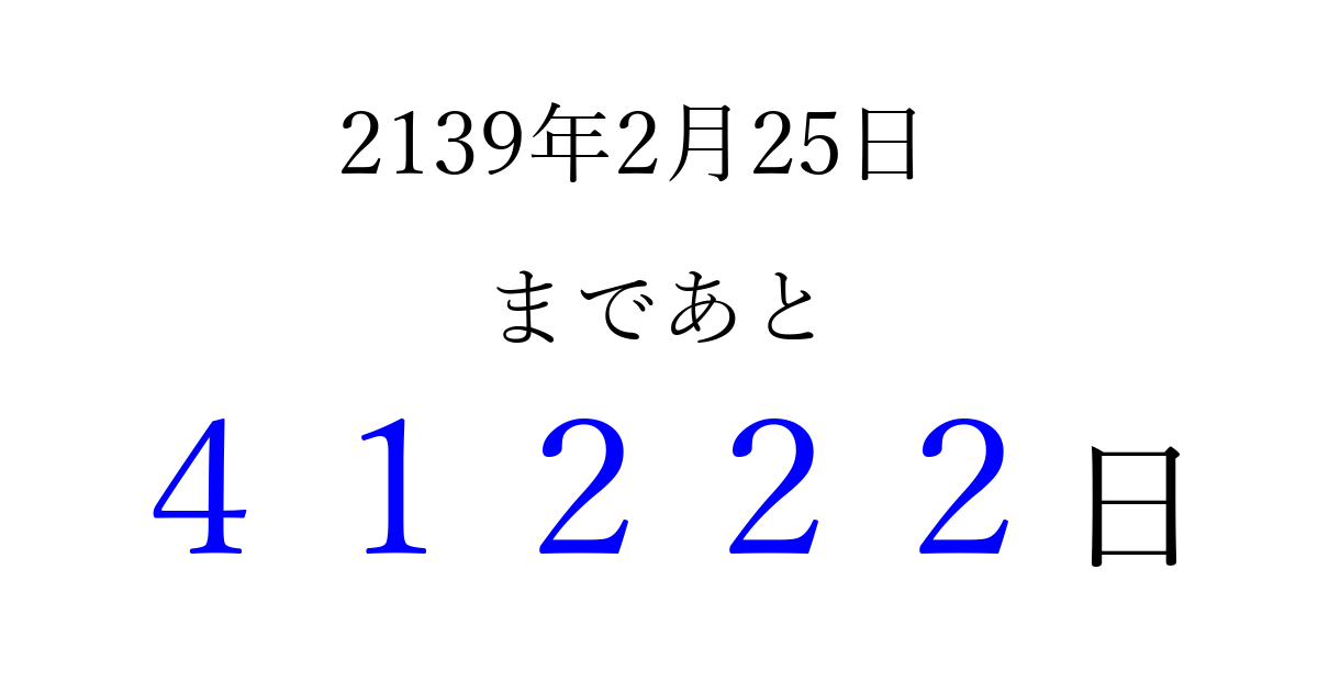 2139年2月25日(水)まで あと 99999 日です 追加すると、トップページからすぐ選べるようになります ※2026/04/16現在の結果です。 最新の状態に更新する ↓シェアして、タイムライン上にカウントダウンを表示しよう!↓ 📤 この結果を共有する Tweet シェア Threads Bluesky 別の日付でカウントダウン 2139年2月のカレンダー このページをブックマークに追加すると、いつでもカウントダウンを確認できます。 (PC: Ctrl+D / Mac: ⌘+D) hitome-notes.comでは以下のページも運営しています。 指定日と期間から日付を計算 | ガチャ確率計算・シミュレーション | プライバシー・ポリシー 運営者:Avocado