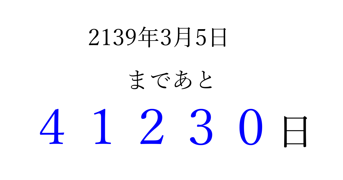 2139年3月5日(木)まで あと 99999 日です 追加すると、トップページからすぐ選べるようになります ※2026/04/16現在の結果です。 最新の状態に更新する ↓シェアして、タイムライン上にカウントダウンを表示しよう!↓ 📤 この結果を共有する Tweet シェア Threads Bluesky 別の日付でカウントダウン 2139年3月のカレンダー このページをブックマークに追加すると、いつでもカウントダウンを確認できます。 (PC: Ctrl+D / Mac: ⌘+D) hitome-notes.comでは以下のページも運営しています。 指定日と期間から日付を計算 | ガチャ確率計算・シミュレーション | プライバシー・ポリシー 運営者:Avocado