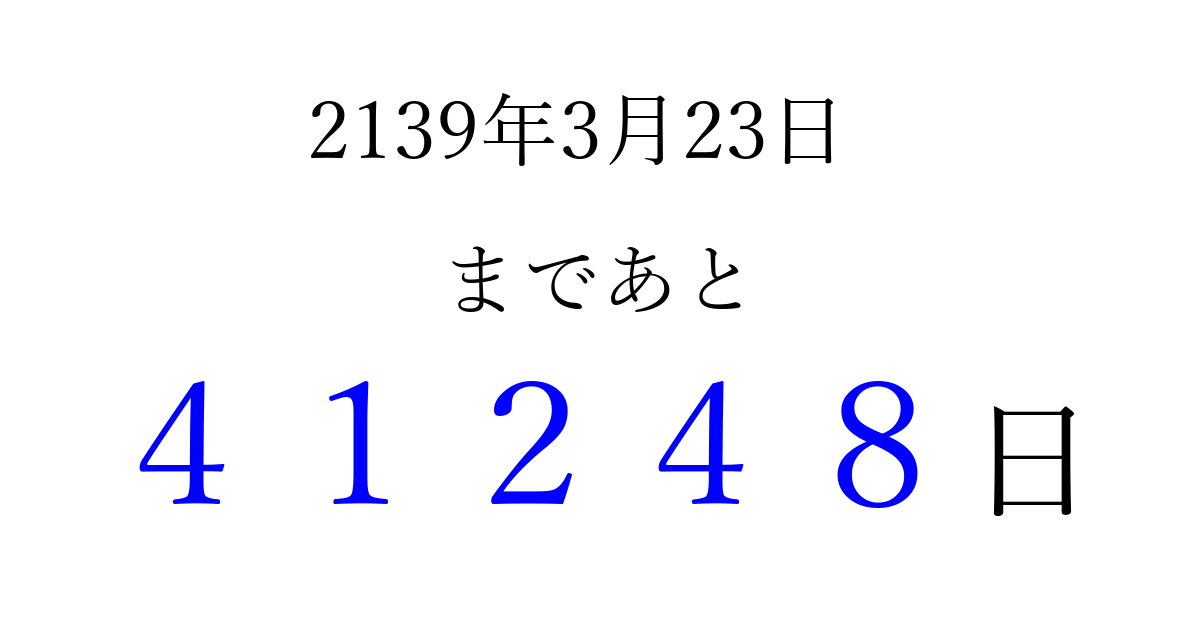 2139年3月23日(月)まで あと 99999 日です 追加すると、トップページからすぐ選べるようになります ※2026/04/16現在の結果です。 最新の状態に更新する ↓シェアして、タイムライン上にカウントダウンを表示しよう!↓ 📤 この結果を共有する Tweet シェア Threads Bluesky 別の日付でカウントダウン 2139年3月のカレンダー このページをブックマークに追加すると、いつでもカウントダウンを確認できます。 (PC: Ctrl+D / Mac: ⌘+D) hitome-notes.comでは以下のページも運営しています。 指定日と期間から日付を計算 | ガチャ確率計算・シミュレーション | プライバシー・ポリシー 運営者:Avocado