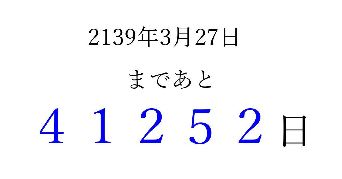 2139年3月27日(金)まで あと 99999 日です 追加すると、トップページからすぐ選べるようになります ※2026/04/16現在の結果です。 最新の状態に更新する ↓シェアして、タイムライン上にカウントダウンを表示しよう!↓ 📤 この結果を共有する Tweet シェア Threads Bluesky 別の日付でカウントダウン 2139年3月のカレンダー このページをブックマークに追加すると、いつでもカウントダウンを確認できます。 (PC: Ctrl+D / Mac: ⌘+D) hitome-notes.comでは以下のページも運営しています。 指定日と期間から日付を計算 | ガチャ確率計算・シミュレーション | プライバシー・ポリシー 運営者:Avocado