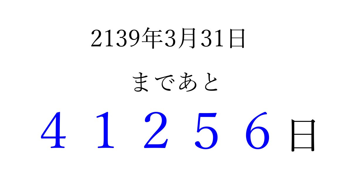 2139年3月31日(火)まで あと 99999 日です 追加すると、トップページからすぐ選べるようになります ※2026/04/16現在の結果です。 最新の状態に更新する ↓シェアして、タイムライン上にカウントダウンを表示しよう!↓ 📤 この結果を共有する Tweet シェア Threads Bluesky 別の日付でカウントダウン 2139年3月のカレンダー このページをブックマークに追加すると、いつでもカウントダウンを確認できます。 (PC: Ctrl+D / Mac: ⌘+D) hitome-notes.comでは以下のページも運営しています。 指定日と期間から日付を計算 | ガチャ確率計算・シミュレーション | プライバシー・ポリシー 運営者:Avocado