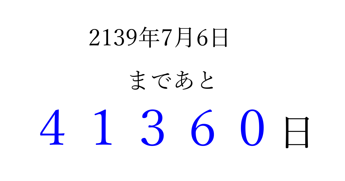 2139年7月6日(月)まで あと 99999 日です 追加すると、トップページからすぐ選べるようになります ※2026/04/09現在の結果です。 最新の状態に更新する ↓シェアして、タイムライン上にカウントダウンを表示しよう!↓ 📤 この結果を共有する Tweet シェア Threads Bluesky 別の日付でカウントダウン 2139年7月のカレンダー このページをブックマークに追加すると、いつでもカウントダウンを確認できます。 (PC: Ctrl+D / Mac: ⌘+D) hitome-notes.comでは以下のページも運営しています。 指定日と期間から日付を計算 | ガチャ確率計算・シミュレーション | プライバシー・ポリシー 運営者:Avocado