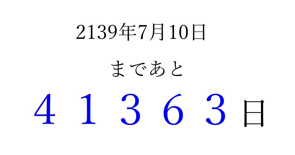 2139年7月10日(金)まで あと 99999 日です 追加すると、トップページからすぐ選べるようになります ※2026/04/10現在の結果です。 最新の状態に更新する ↓シェアして、タイムライン上にカウントダウンを表示しよう!↓ 📤 この結果を共有する Tweet シェア Threads Bluesky 別の日付でカウントダウン 2139年7月のカレンダー このページをブックマークに追加すると、いつでもカウントダウンを確認できます。 (PC: Ctrl+D / Mac: ⌘+D) hitome-notes.comでは以下のページも運営しています。 指定日と期間から日付を計算 | ガチャ確率計算・シミュレーション | プライバシー・ポリシー 運営者:Avocado
