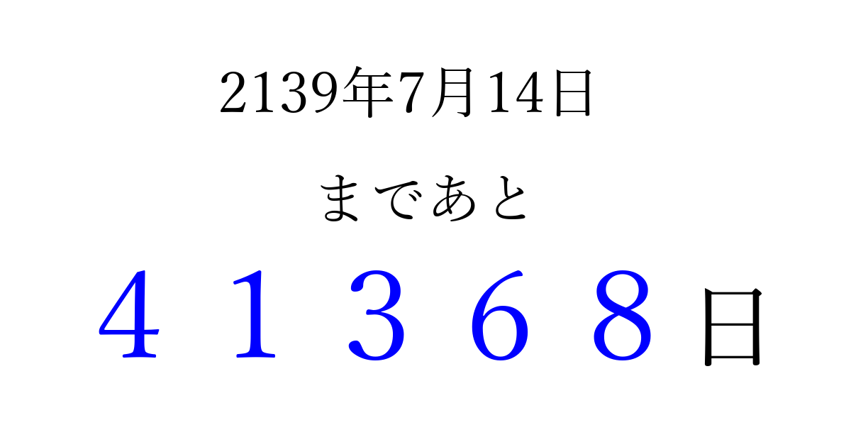 2139年7月14日(火)まで あと 99999 日です 追加すると、トップページからすぐ選べるようになります ※2026/04/09現在の結果です。 最新の状態に更新する ↓シェアして、タイムライン上にカウントダウンを表示しよう!↓ 📤 この結果を共有する Tweet シェア Threads Bluesky 別の日付でカウントダウン 2139年7月のカレンダー このページをブックマークに追加すると、いつでもカウントダウンを確認できます。 (PC: Ctrl+D / Mac: ⌘+D) hitome-notes.comでは以下のページも運営しています。 指定日と期間から日付を計算 | ガチャ確率計算・シミュレーション | プライバシー・ポリシー 運営者:Avocado