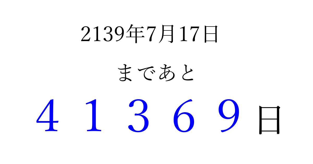 2139年7月17日(金)まで あと 99999 日です 追加すると、トップページからすぐ選べるようになります ※2026/04/15現在の結果です。 最新の状態に更新する ↓シェアして、タイムライン上にカウントダウンを表示しよう!↓ 📤 この結果を共有する Tweet シェア Threads Bluesky 別の日付でカウントダウン 2139年7月のカレンダー このページをブックマークに追加すると、いつでもカウントダウンを確認できます。 (PC: Ctrl+D / Mac: ⌘+D) hitome-notes.comでは以下のページも運営しています。 指定日と期間から日付を計算 | ガチャ確率計算・シミュレーション | プライバシー・ポリシー 運営者:Avocado