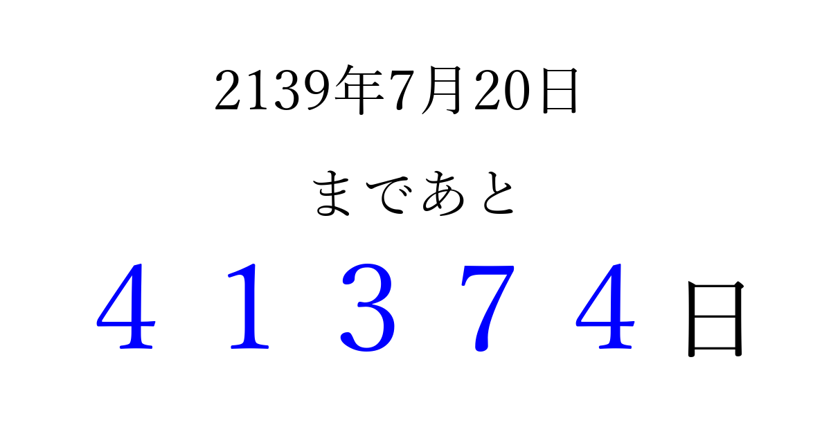 2139年7月20日(月)まで あと 99999 日です 追加すると、トップページからすぐ選べるようになります ※2026/04/09現在の結果です。 最新の状態に更新する ↓シェアして、タイムライン上にカウントダウンを表示しよう!↓ 📤 この結果を共有する Tweet シェア Threads Bluesky 別の日付でカウントダウン 2139年7月のカレンダー このページをブックマークに追加すると、いつでもカウントダウンを確認できます。 (PC: Ctrl+D / Mac: ⌘+D) hitome-notes.comでは以下のページも運営しています。 指定日と期間から日付を計算 | ガチャ確率計算・シミュレーション | プライバシー・ポリシー 運営者:Avocado