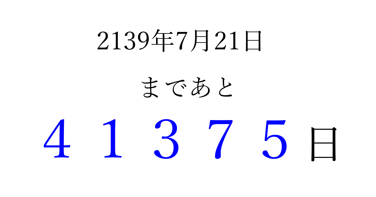 2139年7月21日(火)まで あと 99999 日です 追加すると、トップページからすぐ選べるようになります ※2026/04/09現在の結果です。 最新の状態に更新する ↓シェアして、タイムライン上にカウントダウンを表示しよう!↓ 📤 この結果を共有する Tweet シェア Threads Bluesky 別の日付でカウントダウン 2139年7月のカレンダー このページをブックマークに追加すると、いつでもカウントダウンを確認できます。 (PC: Ctrl+D / Mac: ⌘+D) hitome-notes.comでは以下のページも運営しています。 指定日と期間から日付を計算 | ガチャ確率計算・シミュレーション | プライバシー・ポリシー 運営者:Avocado