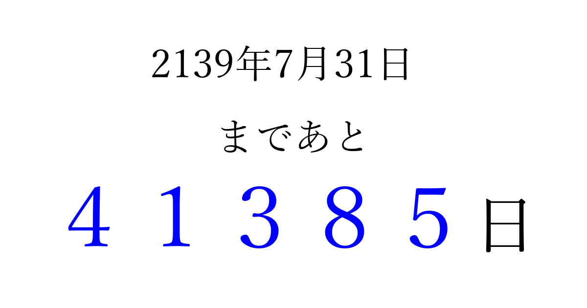 2139年7月31日(金)まで あと 99999 日です 追加すると、トップページからすぐ選べるようになります ※2026/04/09現在の結果です。 最新の状態に更新する ↓シェアして、タイムライン上にカウントダウンを表示しよう!↓ 📤 この結果を共有する Tweet シェア Threads Bluesky 別の日付でカウントダウン 2139年7月のカレンダー このページをブックマークに追加すると、いつでもカウントダウンを確認できます。 (PC: Ctrl+D / Mac: ⌘+D) hitome-notes.comでは以下のページも運営しています。 指定日と期間から日付を計算 | ガチャ確率計算・シミュレーション | プライバシー・ポリシー 運営者:Avocado