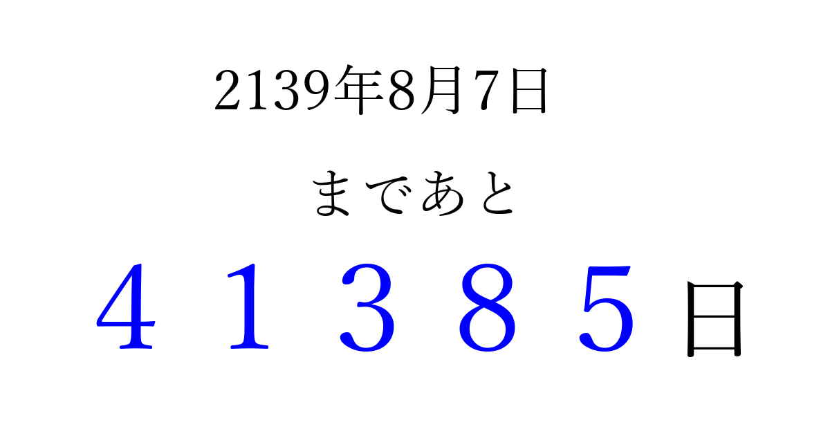 2139年8月7日(金)まで あと 99999 日です 追加すると、トップページからすぐ選べるようになります ※2026/04/16現在の結果です。 最新の状態に更新する ↓シェアして、タイムライン上にカウントダウンを表示しよう!↓ 📤 この結果を共有する Tweet シェア Threads Bluesky 別の日付でカウントダウン 2139年8月のカレンダー このページをブックマークに追加すると、いつでもカウントダウンを確認できます。 (PC: Ctrl+D / Mac: ⌘+D) hitome-notes.comでは以下のページも運営しています。 指定日と期間から日付を計算 | ガチャ確率計算・シミュレーション | プライバシー・ポリシー 運営者:Avocado