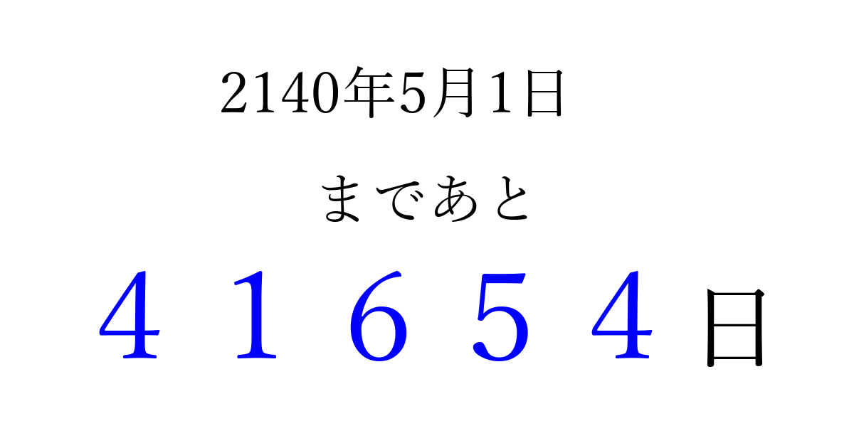 2140年5月1日(日)まで あと 99999 日です 追加すると、トップページからすぐ選べるようになります ※2026/04/15現在の結果です。 最新の状態に更新する ↓シェアして、タイムライン上にカウントダウンを表示しよう!↓ 📤 この結果を共有する Tweet シェア Threads Bluesky 別の日付でカウントダウン 2140年5月のカレンダー このページをブックマークに追加すると、いつでもカウントダウンを確認できます。 (PC: Ctrl+D / Mac: ⌘+D) hitome-notes.comでは以下のページも運営しています。 指定日と期間から日付を計算 | ガチャ確率計算・シミュレーション | プライバシー・ポリシー 運営者:Avocado