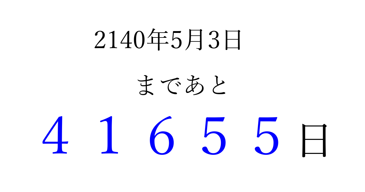 2140年5月3日(火)まで あと 99999 日です 追加すると、トップページからすぐ選べるようになります ※2026/04/16現在の結果です。 最新の状態に更新する ↓シェアして、タイムライン上にカウントダウンを表示しよう!↓ 📤 この結果を共有する Tweet シェア Threads Bluesky 別の日付でカウントダウン 2140年5月のカレンダー このページをブックマークに追加すると、いつでもカウントダウンを確認できます。 (PC: Ctrl+D / Mac: ⌘+D) hitome-notes.comでは以下のページも運営しています。 指定日と期間から日付を計算 | ガチャ確率計算・シミュレーション | プライバシー・ポリシー 運営者:Avocado