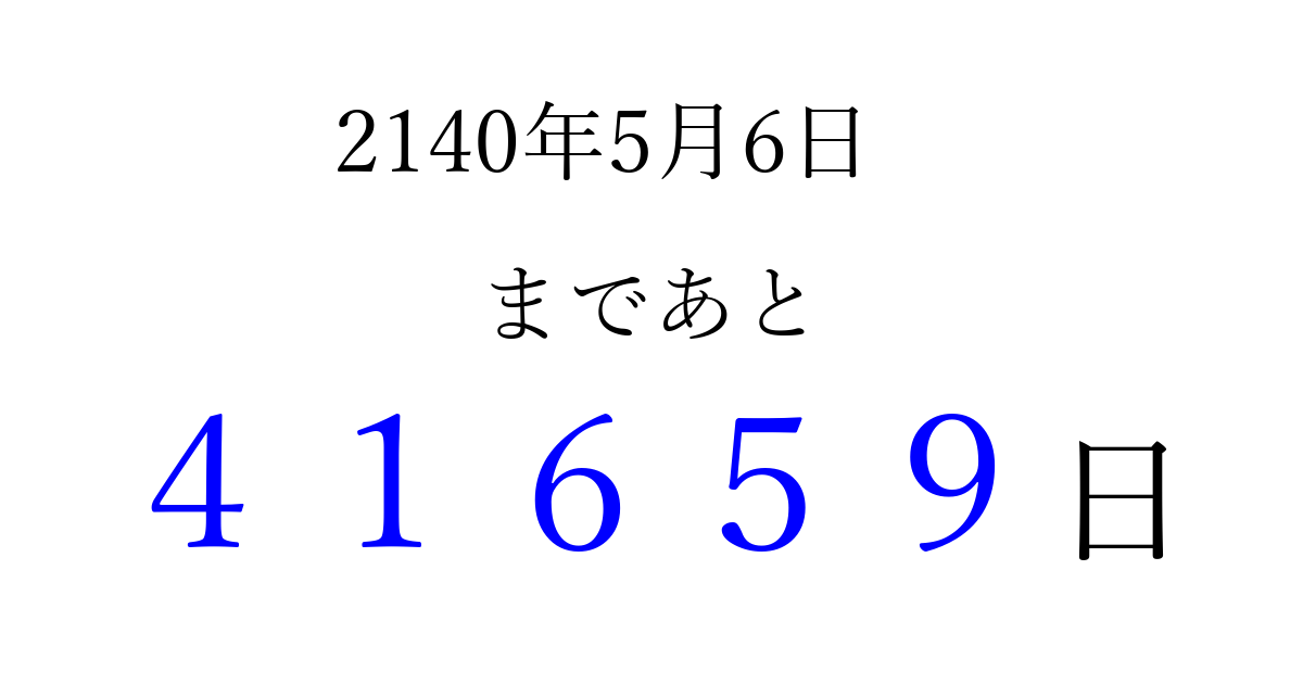 2140年5月6日(金)まで あと 99999 日です 追加すると、トップページからすぐ選べるようになります ※2026/04/15現在の結果です。 最新の状態に更新する ↓シェアして、タイムライン上にカウントダウンを表示しよう!↓ 📤 この結果を共有する Tweet シェア Threads Bluesky 別の日付でカウントダウン 2140年5月のカレンダー このページをブックマークに追加すると、いつでもカウントダウンを確認できます。 (PC: Ctrl+D / Mac: ⌘+D) hitome-notes.comでは以下のページも運営しています。 指定日と期間から日付を計算 | ガチャ確率計算・シミュレーション | プライバシー・ポリシー 運営者:Avocado