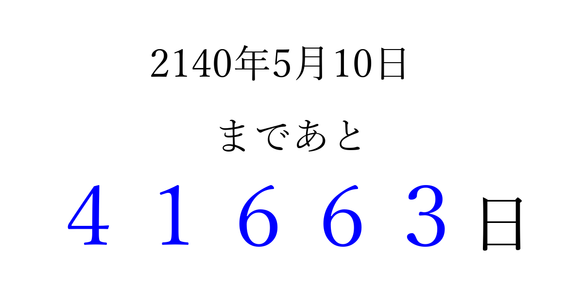 2140年5月10日(火)まで あと 99999 日です 追加すると、トップページからすぐ選べるようになります ※2026/04/15現在の結果です。 最新の状態に更新する ↓シェアして、タイムライン上にカウントダウンを表示しよう!↓ 📤 この結果を共有する Tweet シェア Threads Bluesky 別の日付でカウントダウン 2140年5月のカレンダー このページをブックマークに追加すると、いつでもカウントダウンを確認できます。 (PC: Ctrl+D / Mac: ⌘+D) hitome-notes.comでは以下のページも運営しています。 指定日と期間から日付を計算 | ガチャ確率計算・シミュレーション | プライバシー・ポリシー 運営者:Avocado