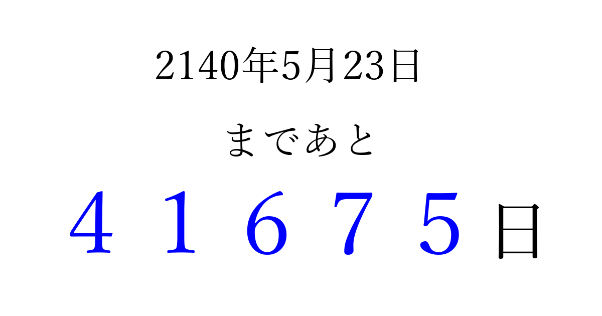 2140年5月23日(月)まで あと 99999 日です 追加すると、トップページからすぐ選べるようになります ※2026/04/16現在の結果です。 最新の状態に更新する ↓シェアして、タイムライン上にカウントダウンを表示しよう!↓ 📤 この結果を共有する Tweet シェア Threads Bluesky 別の日付でカウントダウン 2140年5月のカレンダー このページをブックマークに追加すると、いつでもカウントダウンを確認できます。 (PC: Ctrl+D / Mac: ⌘+D) hitome-notes.comでは以下のページも運営しています。 指定日と期間から日付を計算 | ガチャ確率計算・シミュレーション | プライバシー・ポリシー 運営者:Avocado