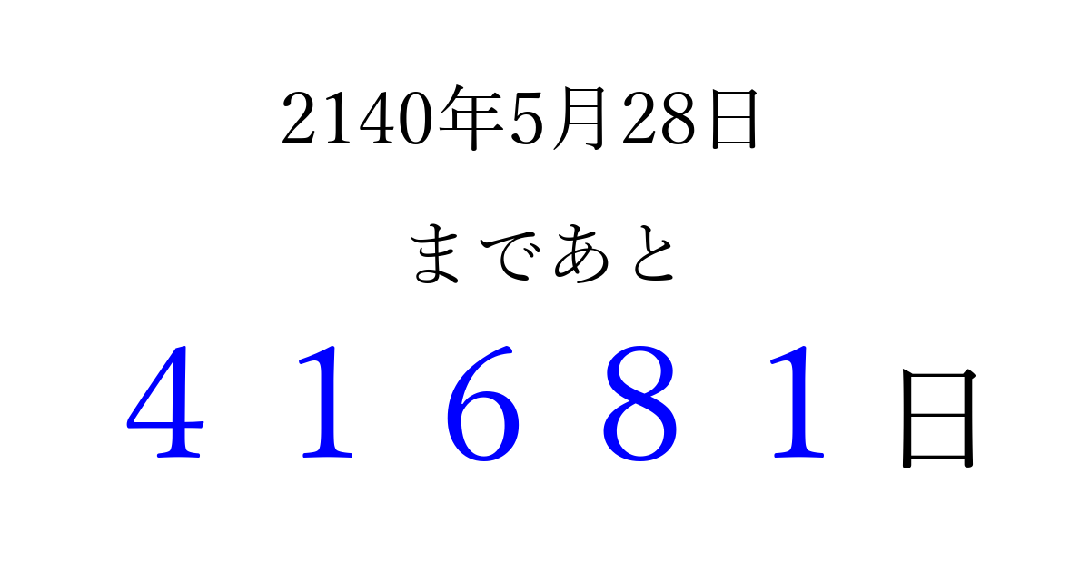 2140年5月28日(土)まで あと 99999 日です 追加すると、トップページからすぐ選べるようになります ※2026/04/15現在の結果です。 最新の状態に更新する ↓シェアして、タイムライン上にカウントダウンを表示しよう!↓ 📤 この結果を共有する Tweet シェア Threads Bluesky 別の日付でカウントダウン 2140年5月のカレンダー このページをブックマークに追加すると、いつでもカウントダウンを確認できます。 (PC: Ctrl+D / Mac: ⌘+D) hitome-notes.comでは以下のページも運営しています。 指定日と期間から日付を計算 | ガチャ確率計算・シミュレーション | プライバシー・ポリシー 運営者:Avocado