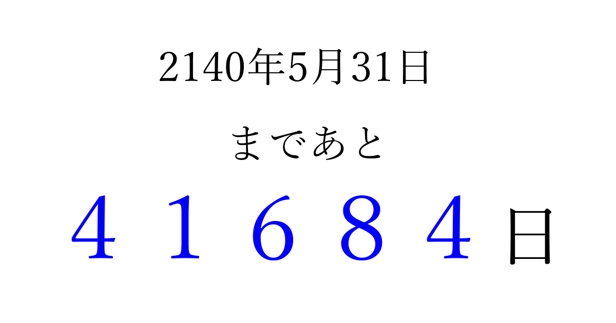 2140年5月31日(火)まで あと 99999 日です 追加すると、トップページからすぐ選べるようになります ※2026/04/15現在の結果です。 最新の状態に更新する ↓シェアして、タイムライン上にカウントダウンを表示しよう!↓ 📤 この結果を共有する Tweet シェア Threads Bluesky 別の日付でカウントダウン 2140年5月のカレンダー このページをブックマークに追加すると、いつでもカウントダウンを確認できます。 (PC: Ctrl+D / Mac: ⌘+D) hitome-notes.comでは以下のページも運営しています。 指定日と期間から日付を計算 | ガチャ確率計算・シミュレーション | プライバシー・ポリシー 運営者:Avocado