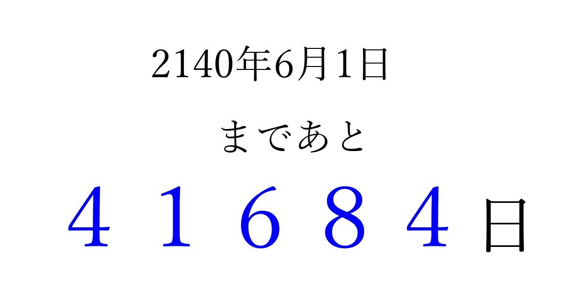 2140年6月1日(水)まで あと 99999 日です 追加すると、トップページからすぐ選べるようになります ※2026/04/16現在の結果です。 最新の状態に更新する ↓シェアして、タイムライン上にカウントダウンを表示しよう!↓ 📤 この結果を共有する Tweet シェア Threads Bluesky 別の日付でカウントダウン 2140年6月のカレンダー このページをブックマークに追加すると、いつでもカウントダウンを確認できます。 (PC: Ctrl+D / Mac: ⌘+D) hitome-notes.comでは以下のページも運営しています。 指定日と期間から日付を計算 | ガチャ確率計算・シミュレーション | プライバシー・ポリシー 運営者:Avocado