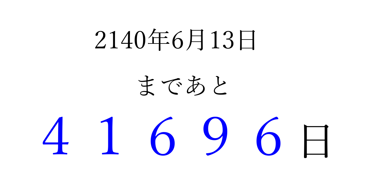 2140年6月13日(月)まで あと 99999 日です 追加すると、トップページからすぐ選べるようになります ※2026/04/16現在の結果です。 最新の状態に更新する ↓シェアして、タイムライン上にカウントダウンを表示しよう!↓ 📤 この結果を共有する Tweet シェア Threads Bluesky 別の日付でカウントダウン 2140年6月のカレンダー このページをブックマークに追加すると、いつでもカウントダウンを確認できます。 (PC: Ctrl+D / Mac: ⌘+D) hitome-notes.comでは以下のページも運営しています。 指定日と期間から日付を計算 | ガチャ確率計算・シミュレーション | プライバシー・ポリシー 運営者:Avocado
