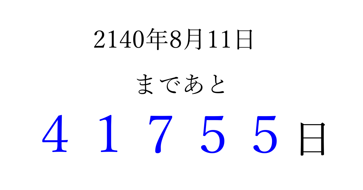 2140年8月11日(木)まで あと 99999 日です 追加すると、トップページからすぐ選べるようになります ※2026/04/16現在の結果です。 最新の状態に更新する ↓シェアして、タイムライン上にカウントダウンを表示しよう!↓ 📤 この結果を共有する Tweet シェア Threads Bluesky 別の日付でカウントダウン 2140年8月のカレンダー このページをブックマークに追加すると、いつでもカウントダウンを確認できます。 (PC: Ctrl+D / Mac: ⌘+D) hitome-notes.comでは以下のページも運営しています。 指定日と期間から日付を計算 | ガチャ確率計算・シミュレーション | プライバシー・ポリシー 運営者:Avocado