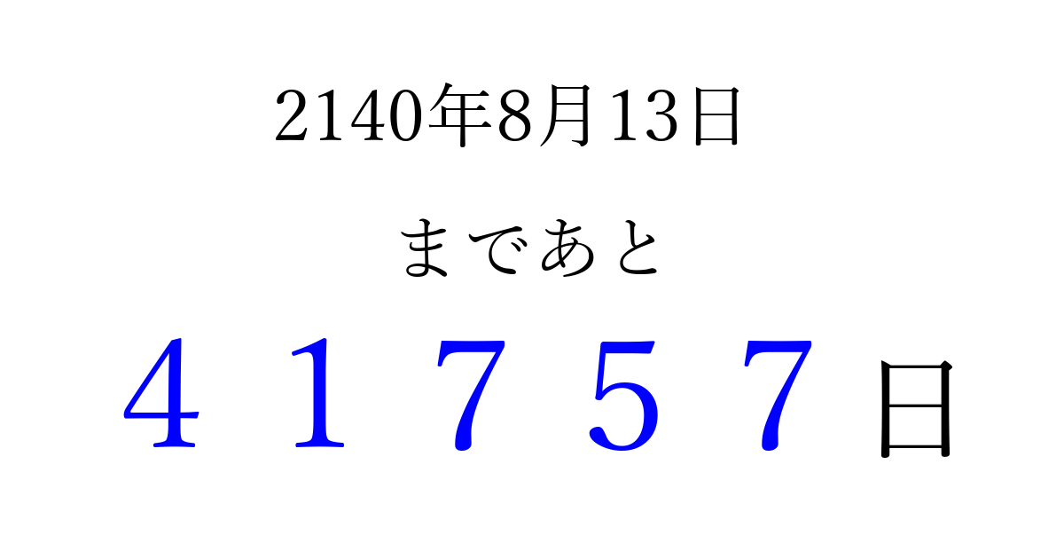 2140年8月13日(土)まで あと 99999 日です 追加すると、トップページからすぐ選べるようになります ※2026/04/16現在の結果です。 最新の状態に更新する ↓シェアして、タイムライン上にカウントダウンを表示しよう!↓ 📤 この結果を共有する Tweet シェア Threads Bluesky 別の日付でカウントダウン 2140年8月のカレンダー このページをブックマークに追加すると、いつでもカウントダウンを確認できます。 (PC: Ctrl+D / Mac: ⌘+D) hitome-notes.comでは以下のページも運営しています。 指定日と期間から日付を計算 | ガチャ確率計算・シミュレーション | プライバシー・ポリシー 運営者:Avocado