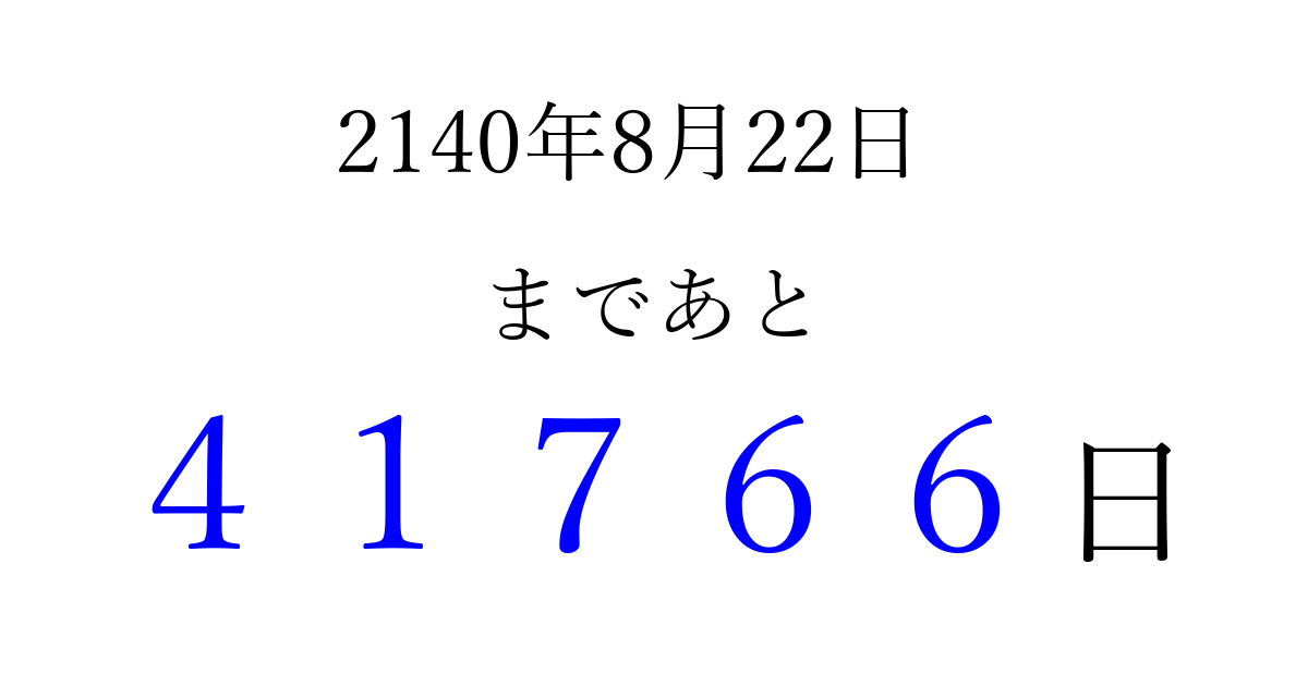 2140年8月22日(月)まで あと 99999 日です 追加すると、トップページからすぐ選べるようになります ※2026/04/16現在の結果です。 最新の状態に更新する ↓シェアして、タイムライン上にカウントダウンを表示しよう!↓ 📤 この結果を共有する Tweet シェア Threads Bluesky 別の日付でカウントダウン 2140年8月のカレンダー このページをブックマークに追加すると、いつでもカウントダウンを確認できます。 (PC: Ctrl+D / Mac: ⌘+D) hitome-notes.comでは以下のページも運営しています。 指定日と期間から日付を計算 | ガチャ確率計算・シミュレーション | プライバシー・ポリシー 運営者:Avocado