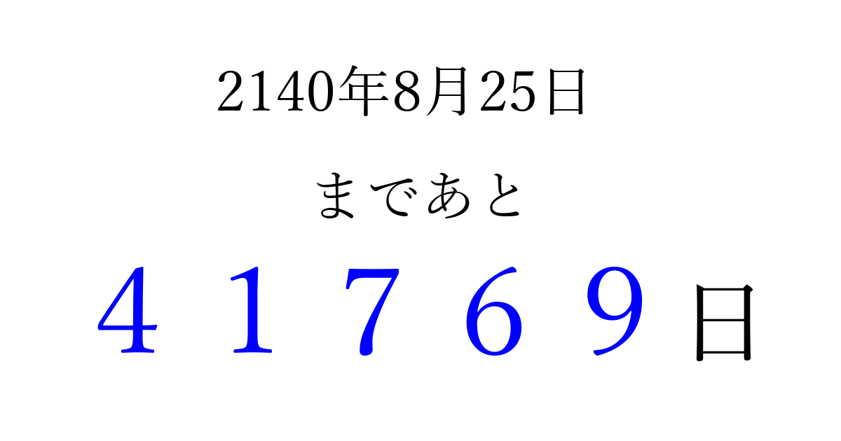 2140年8月25日(木)まで あと 99999 日です 追加すると、トップページからすぐ選べるようになります ※2026/04/16現在の結果です。 最新の状態に更新する ↓シェアして、タイムライン上にカウントダウンを表示しよう!↓ 📤 この結果を共有する Tweet シェア Threads Bluesky 別の日付でカウントダウン 2140年8月のカレンダー このページをブックマークに追加すると、いつでもカウントダウンを確認できます。 (PC: Ctrl+D / Mac: ⌘+D) hitome-notes.comでは以下のページも運営しています。 指定日と期間から日付を計算 | ガチャ確率計算・シミュレーション | プライバシー・ポリシー 運営者:Avocado
