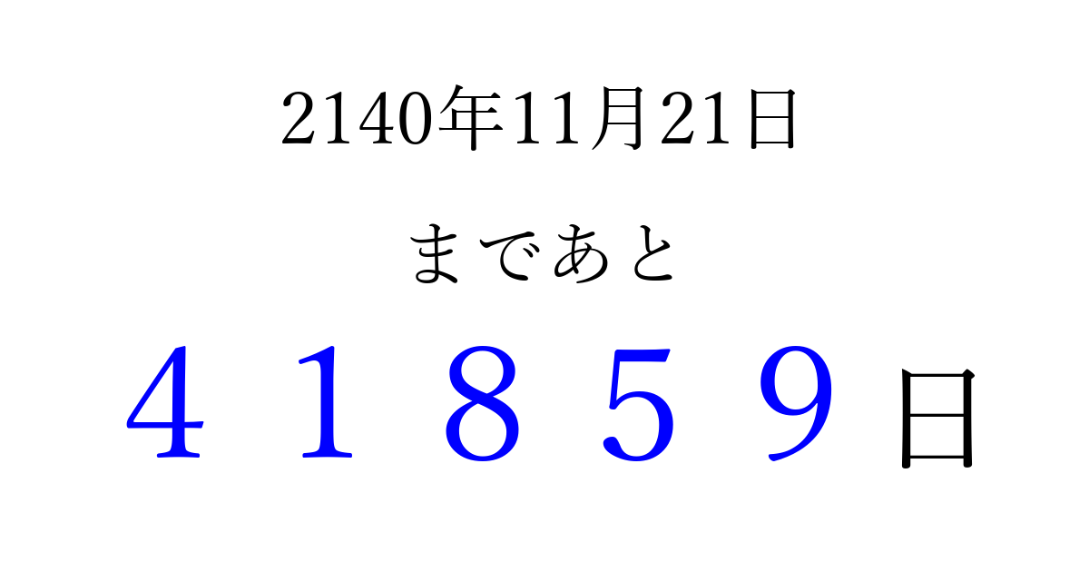 2140年11月21日(月)まで あと 99999 日です 追加すると、トップページからすぐ選べるようになります ※2026/04/14現在の結果です。 最新の状態に更新する ↓シェアして、タイムライン上にカウントダウンを表示しよう!↓ 📤 この結果を共有する Tweet シェア Threads Bluesky 別の日付でカウントダウン 2140年11月のカレンダー このページをブックマークに追加すると、いつでもカウントダウンを確認できます。 (PC: Ctrl+D / Mac: ⌘+D) hitome-notes.comでは以下のページも運営しています。 指定日と期間から日付を計算 | ガチャ確率計算・シミュレーション | プライバシー・ポリシー 運営者:Avocado