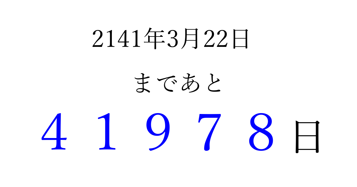 2141年3月22日(水)まで あと 99999 日です 追加すると、トップページからすぐ選べるようになります ※2026/04/16現在の結果です。 最新の状態に更新する ↓シェアして、タイムライン上にカウントダウンを表示しよう!↓ 📤 この結果を共有する Tweet シェア Threads Bluesky 別の日付でカウントダウン 2141年3月のカレンダー このページをブックマークに追加すると、いつでもカウントダウンを確認できます。 (PC: Ctrl+D / Mac: ⌘+D) hitome-notes.comでは以下のページも運営しています。 指定日と期間から日付を計算 | ガチャ確率計算・シミュレーション | プライバシー・ポリシー 運営者:Avocado
